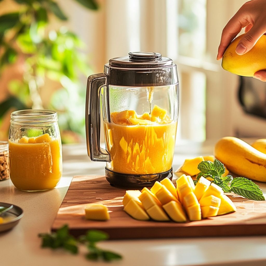 1. 망고 손질: 신선한 망고를 사용한다면 껍질을 벗기고 씨를 제거한 후 잘라주세요. 냉동 망고를 사용할 경우, 그냥 바로 사용하면 됩니다.
