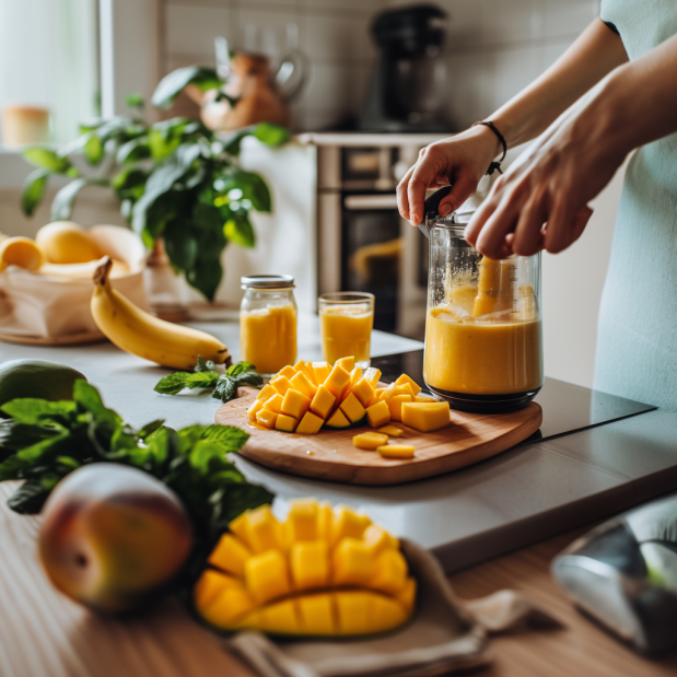 1. 망고 손질: 신선한 망고를 사용한다면 껍질을 벗기고 씨를 제거한 후 잘라주세요. 냉동 망고를 사용할 경우, 그냥 바로 사용하면 됩니다.