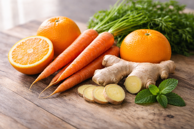 오렌지 당근 생강 주스는 상큼한 감귤의 단맛과 생강의 은은한 매콤함이 어우러진 건강 주스입니다. 만들기 간단하면서도 비타민과 항산화 성분이 풍부하여 면역력 관리에 도움을 줄 수 있습니다.